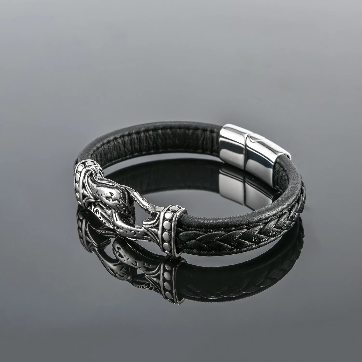 Braided Leather Bracelet; Black Leather With Silver-tone Stainless Steel Ornament, Stand Out But Not Too Gaudy, Go Well With Any Occasion, Great Way to Show You Calm and Lines of Muscle. All Made of High Quality Material, Purely Handmade Tightly Woven Bracelet, Soft and Comfortable Touch Feeling; With Special Stainless Steel Magnetic Clasp, Easy To Put On and No Worry About Losing It During Walk; Strong and Durable, Long Time To Use.