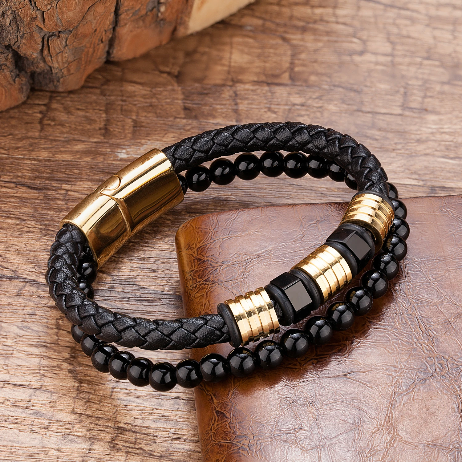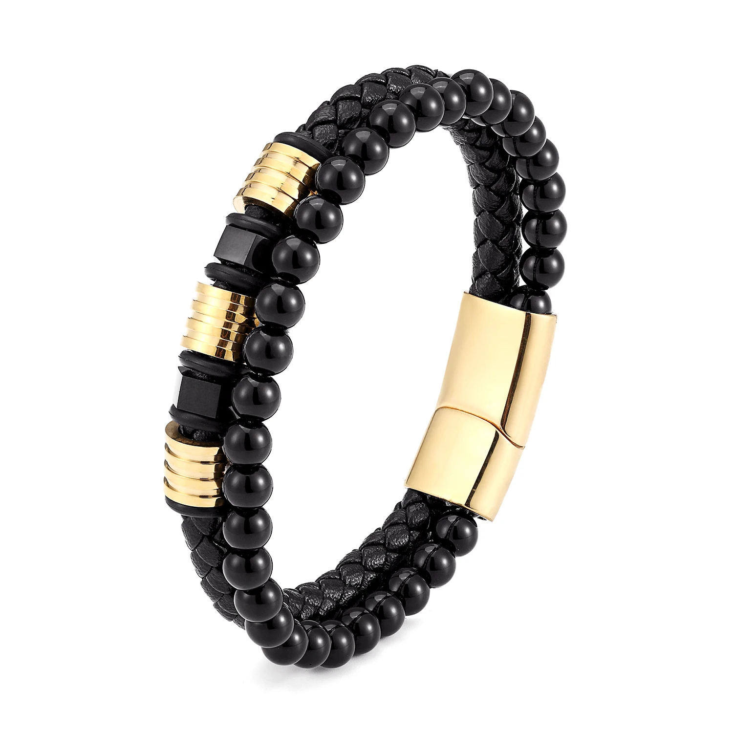 • 2023 Ouyuan Fashion Jewelry Stainless Steel Jewelry Custom Multi Layers Black Bracelet for Men Braided Leather Bracelet