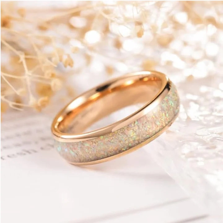4mm High Polished Girls Ring Inlay Crushed White Fire Opal Tungsten Carbide Ring Rose Gold Plated Australian Fire Opal Rings