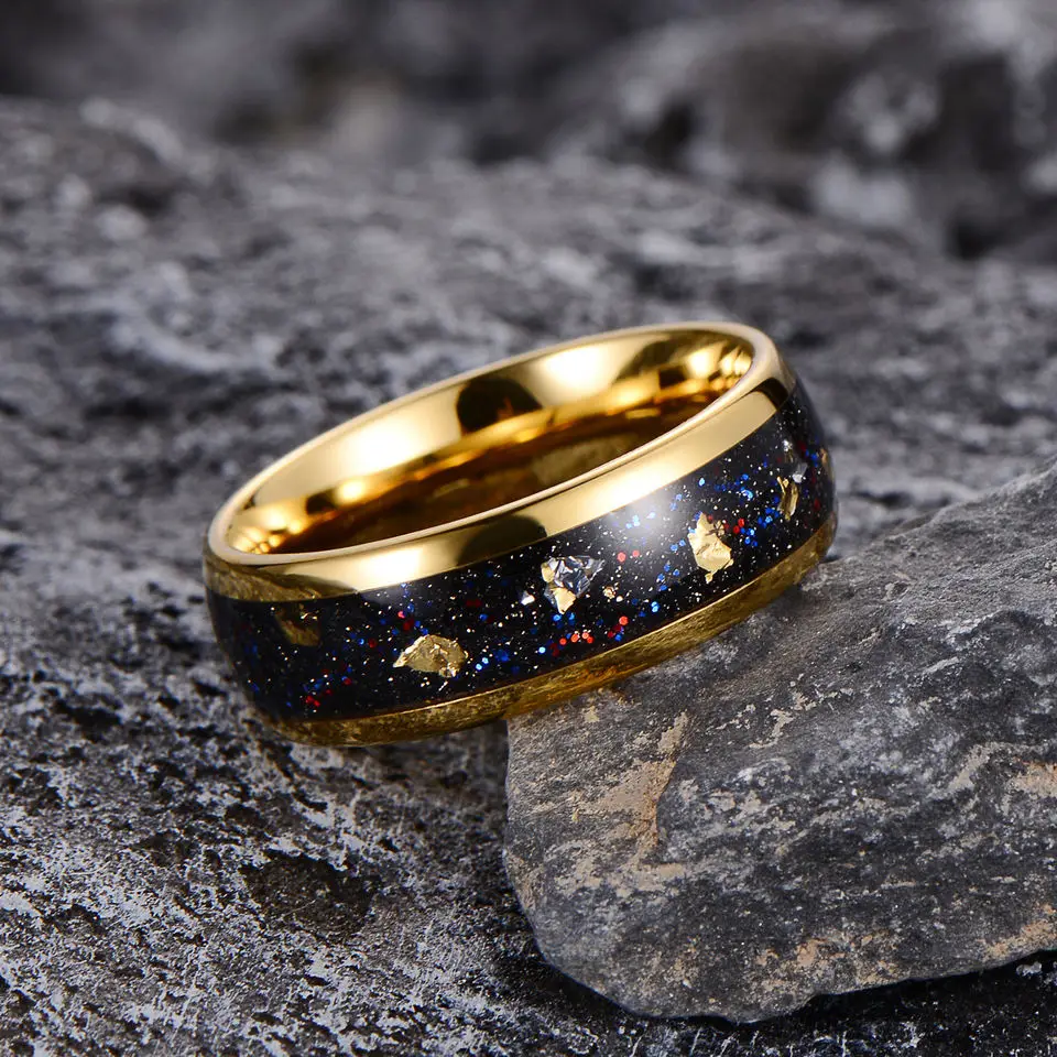 8mm 4mm Dome Tungsten Ring Polished Silver Gold Leaf Meteorite Inlay Wedding Band Gift Couple Ring