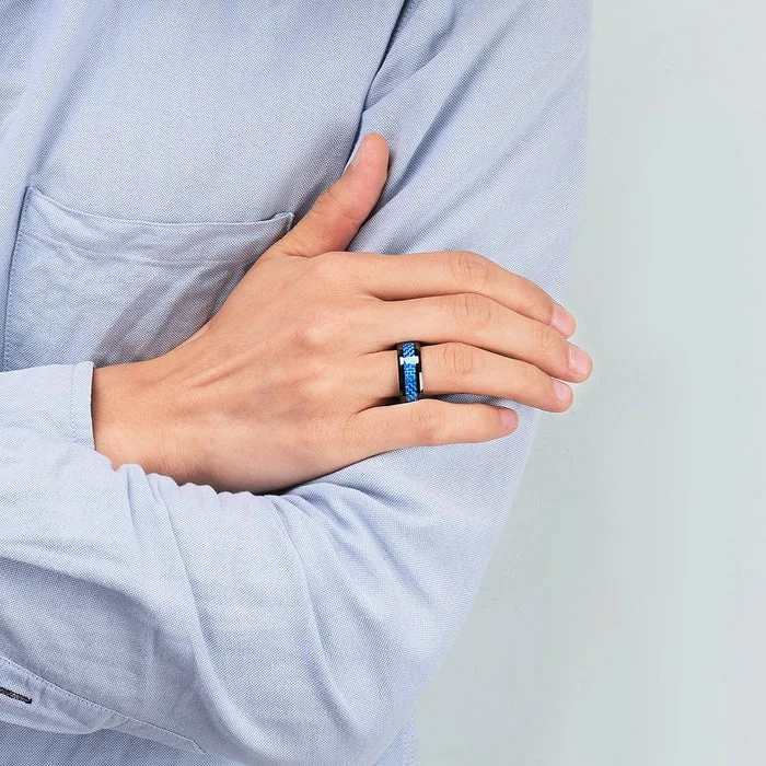 • 8mm Black Tungsten Ring for Men Women Engagement Wedding Band Blue Carbon Fiber Inlay Beveled Comfort Fit