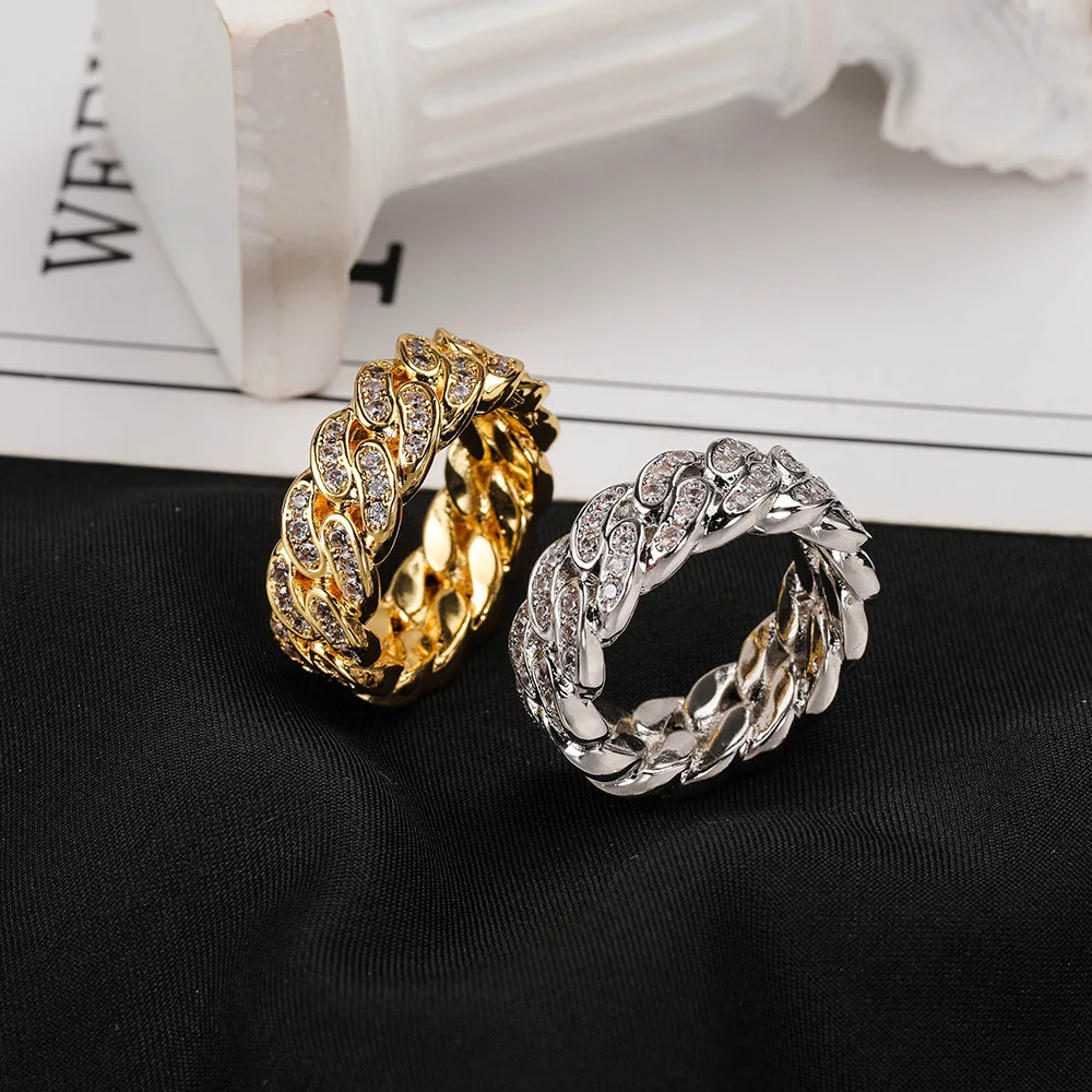 • 8mm European and American Hip Hop Cuban Chain Ring Gold Engagement Rings Zircon Wedding Ring Set