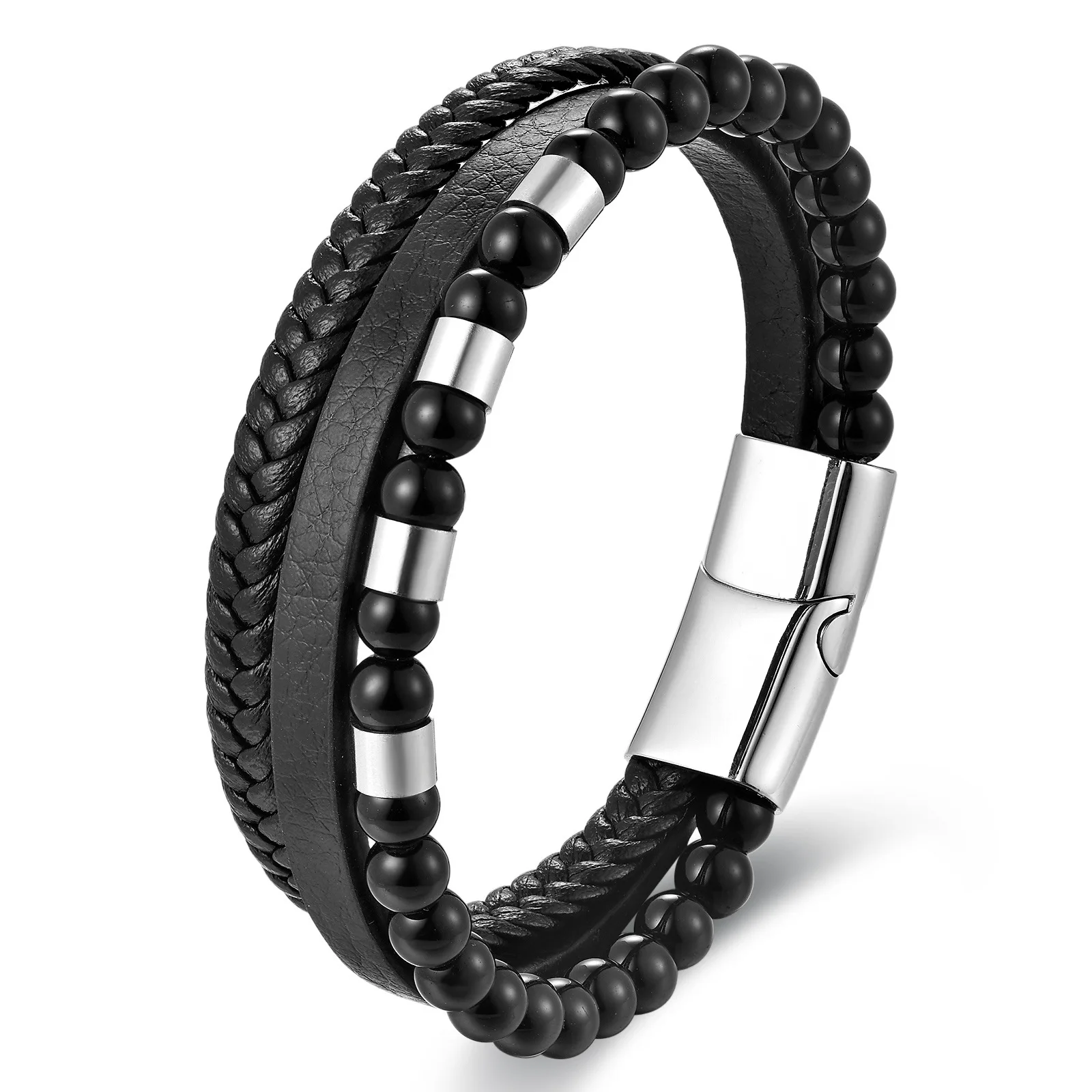 Custom Handmade Adjustable Stainless Steel Leather Bracelet for Men Latest Design Bead Bracelet Black Onyx Fashionable Bangles