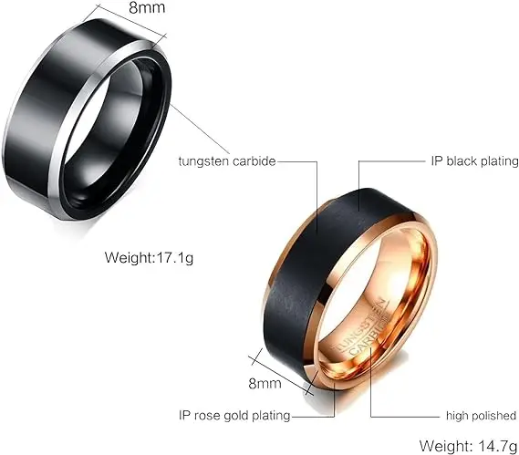 Our tungsten ring for men is engineered to sustain everyday wear with minimal maintenance, maintaining polish clarity and plating adhesion over extended periods. The naturally dense tungsten carbide core ensures structural integrity under mechanical stress, reducing deformation risk. User usability benefits from the fitment range of 6 to 8.5 inches combined with multiple width selections, accommodating various finger geometries. The polished finish combined with comfortable beveled edges optimizes wearer satisfaction. Collectively, these performance attributes support operational efficiency in distribution and high customer retention for wholesale tungsten rings.