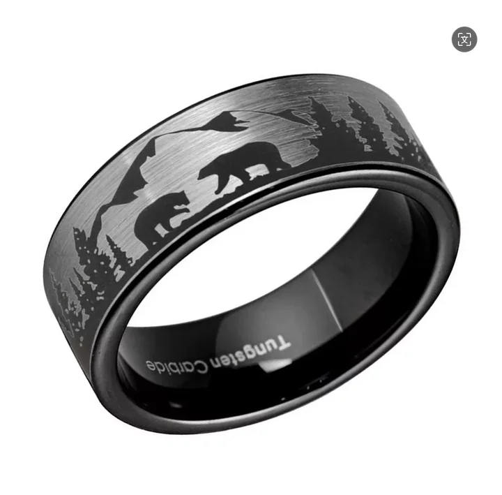 • Custom Made Wedding Ring Men Hunters 8mm Black Gray Bears Forest Mountain Tungsten Band Comfort Fit Ring
