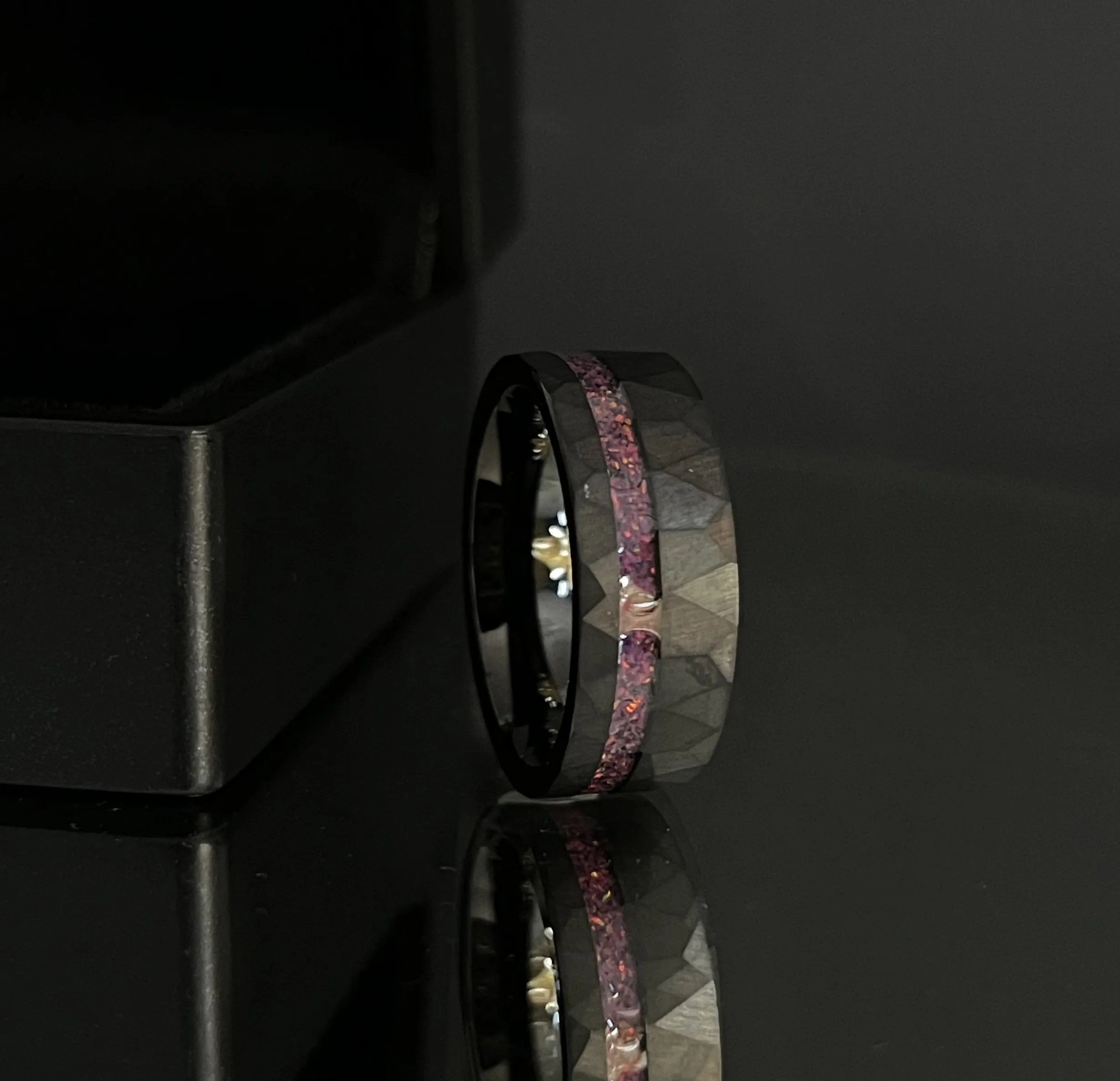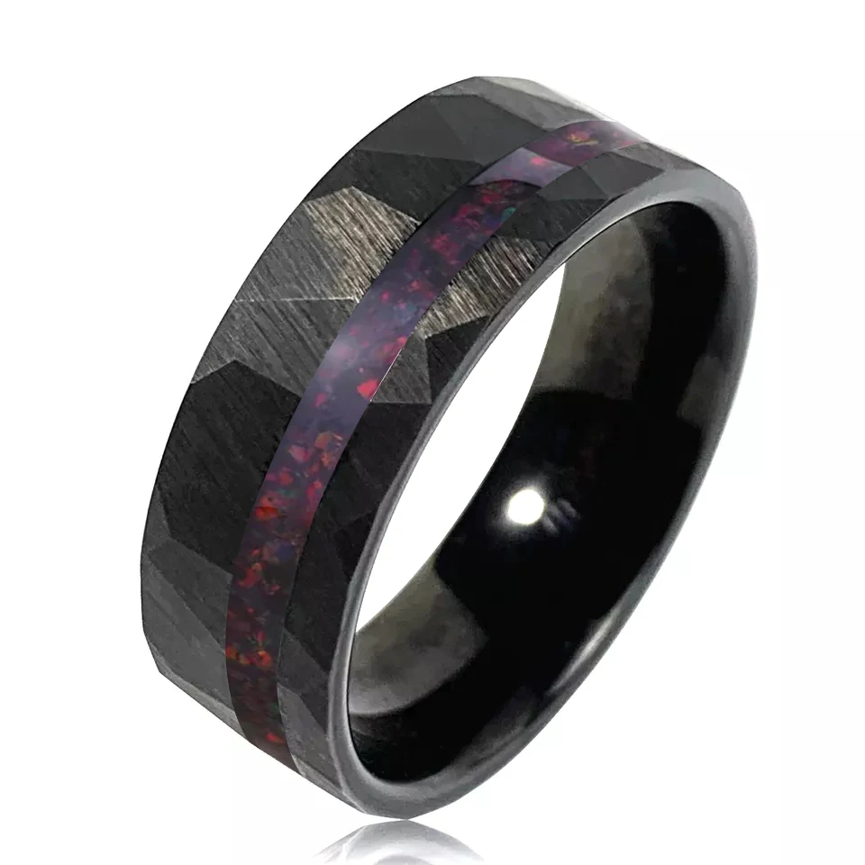 • Dainty 8mm Raw Red Natural Stone Black Hammered Tungsten Fire Opal Ring for Men