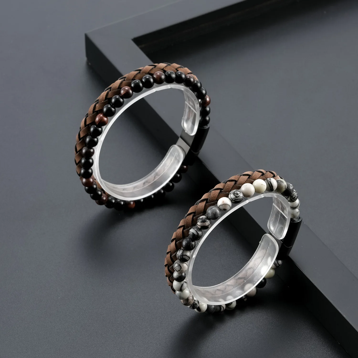 • Double Layers Braided Leather Wrap Bracelets Lava Tiger Eye Natural Stone Beaded Bracelet Magnetic Clasp Leather Bracelet for Me