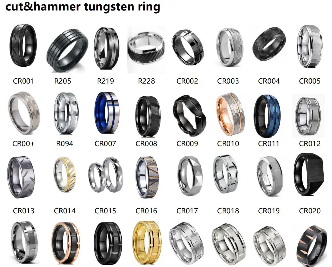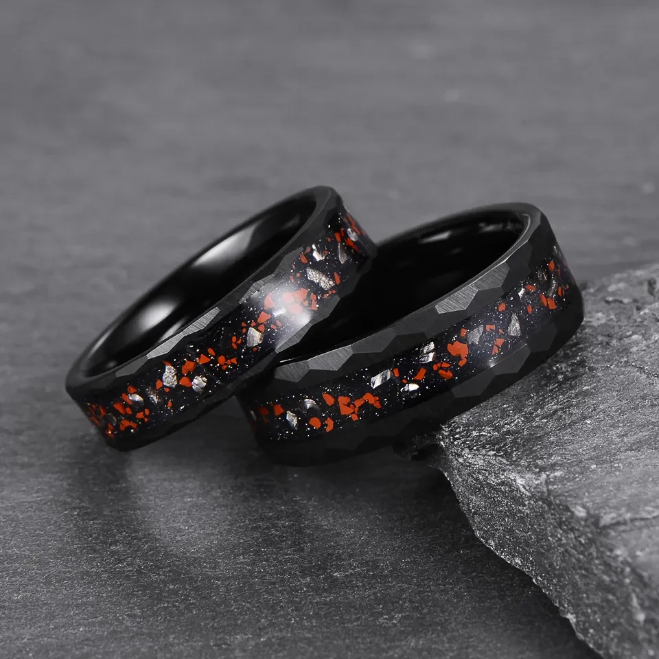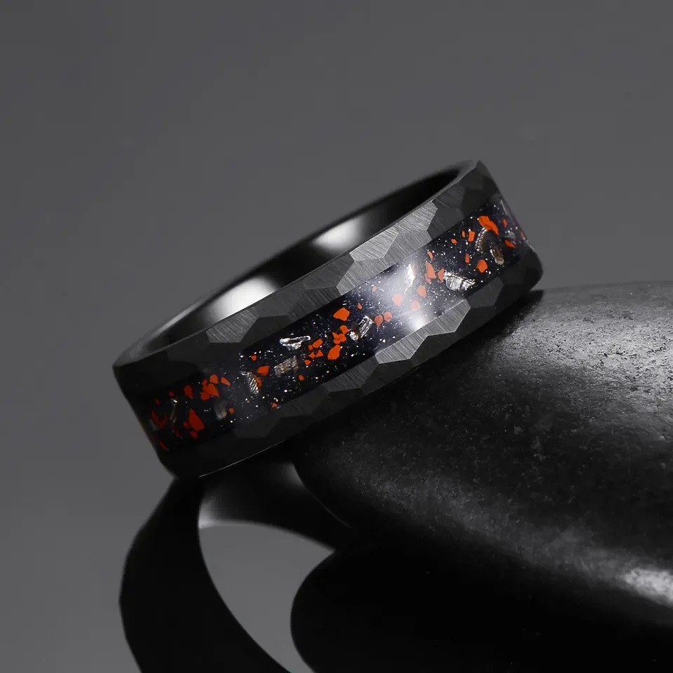 • Factory Direct Sales 8mm Hammered Tungsten Ring for Men Women Dinosaur Meteorite Chip Inlay Fashion Engagement Wedding Band