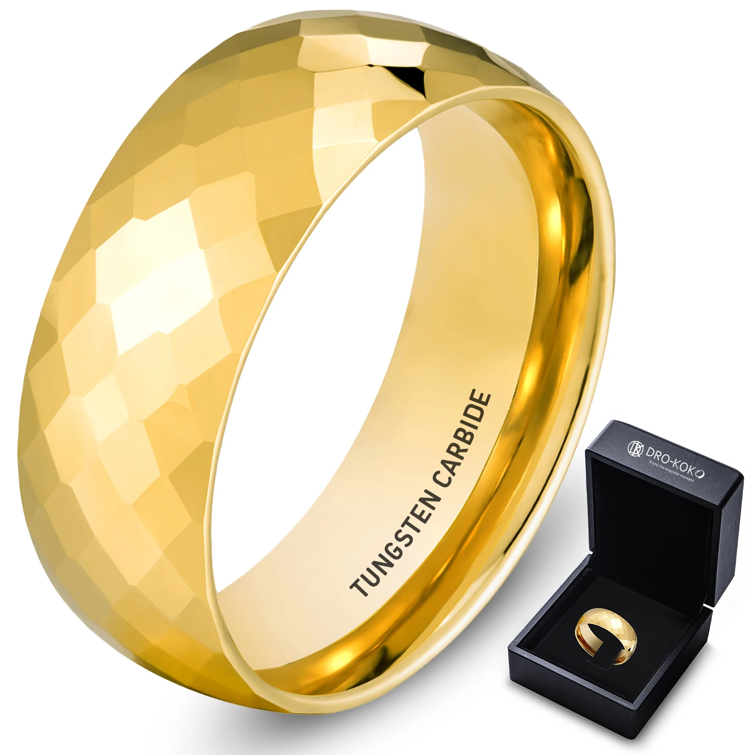 Our collection features a variety of designs to suit every taste, from classic to contemporary. The gold tungsten rings in our collection are plated with 24K gold, offering a luxurious finish that enhances the natural beauty of the tungsten. These gold rings for men are available in a range of sizes from US 4 to 14, including half sizes, ensuring a perfect fit for every wearer. Whether you prefer a flat, domed, or hammered shape, our rings are designed to cater to your personal style. For those seeking something truly unique, we offer custom gold rings for men, allowing you to personalize your ring with your own design, materials, and size preferences.