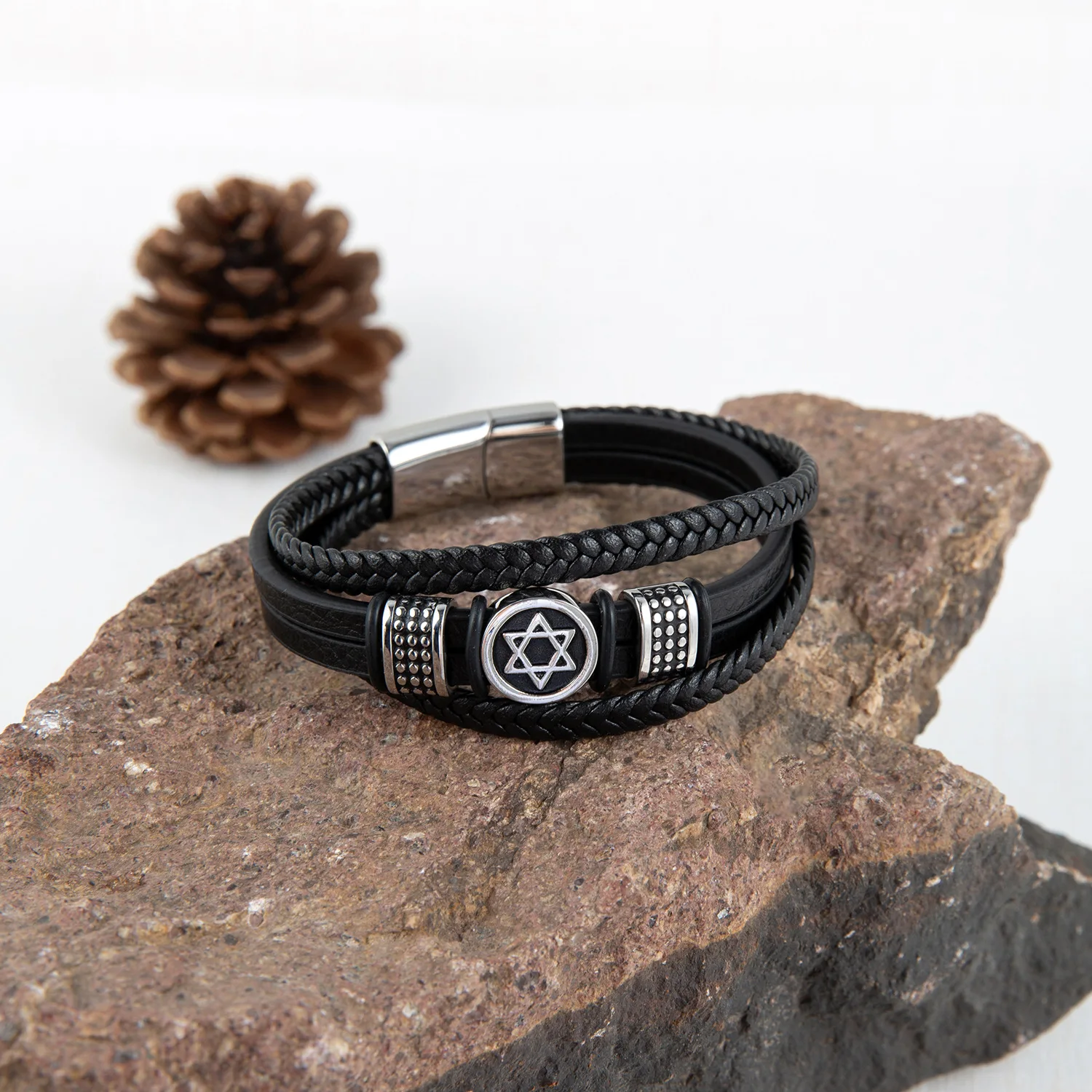 Braided Leather Bracelet; Black Leather With Silver-tone Stainless Steel Ornament, Stand Out But Not Too Gaudy, Go Well With Any Occasion, Great Way to Show You Calm and Lines of Muscle. All Made of High Quality Material, Purely Handmade Tightly Woven Bracelet, Soft and Comfortable Touch Feeling; With Special Stainless Steel Magnetic Clasp, Easy To Put On and No Worry About Losing It During Walk; Strong and Durable, Long Time To Use.