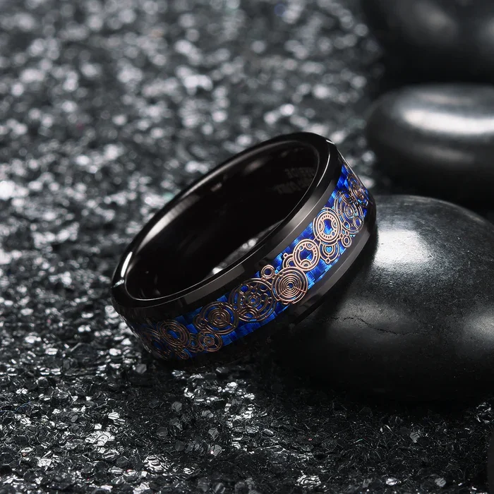 • Fashion Jewelry 8mm Black Tungsten Ring Men Women Couple Wedding Band Steampunk Gear Wheel Carbon Fiber Inlay Comfort Fit