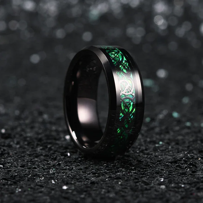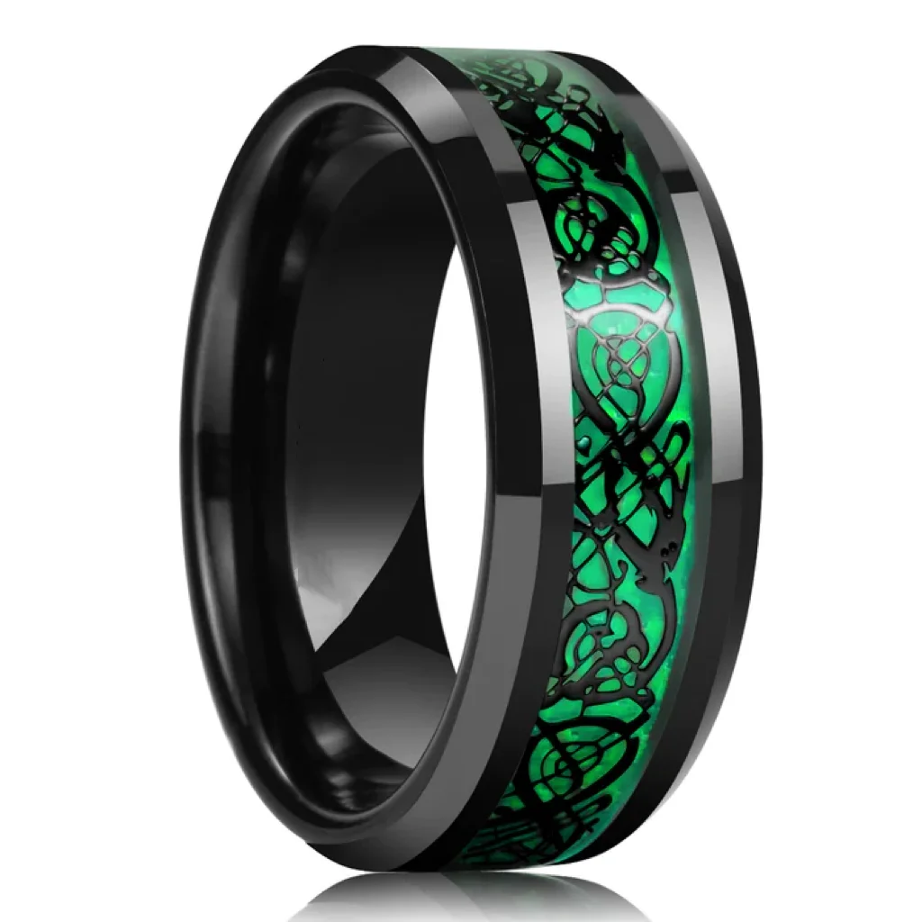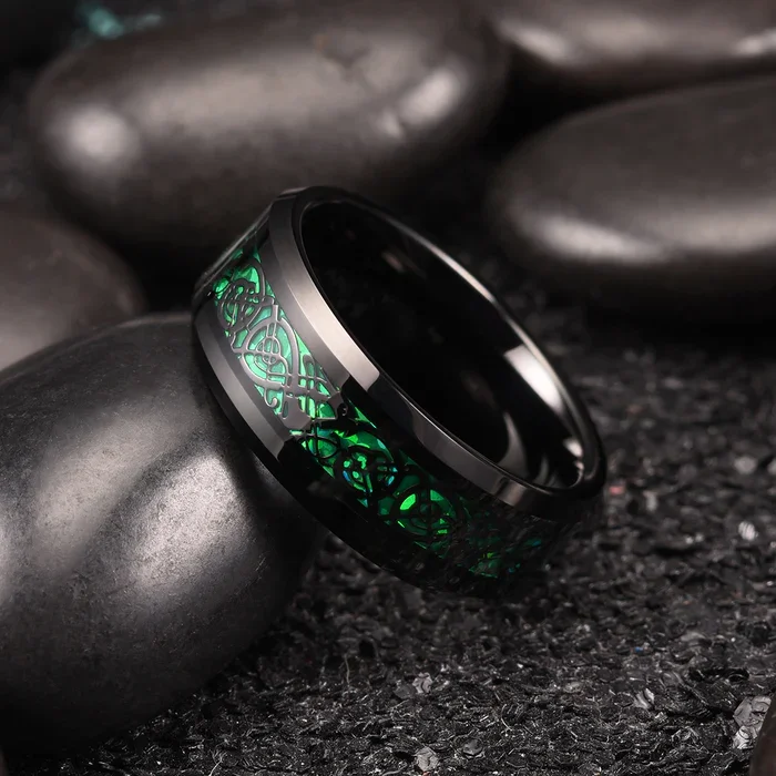 • Fashion Jewelry Rings Custom 8mm Beveled Edge Green Opal Sticker Inlay Tungsten Ring for Men Women