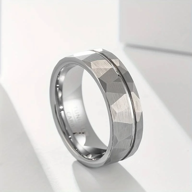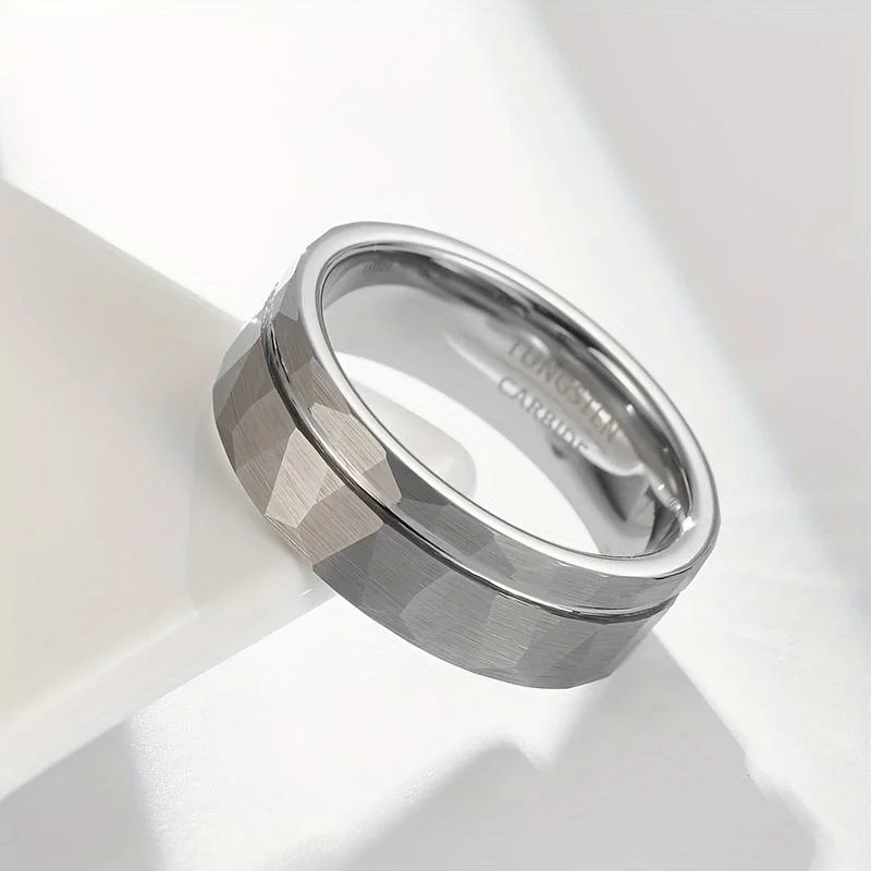 Item Model | Handmade Offset Groove Hammered Tungsten Carbide Rings For Men Silver Tungsten Carbide Ring Tungsten Wedding Ring 8MM |