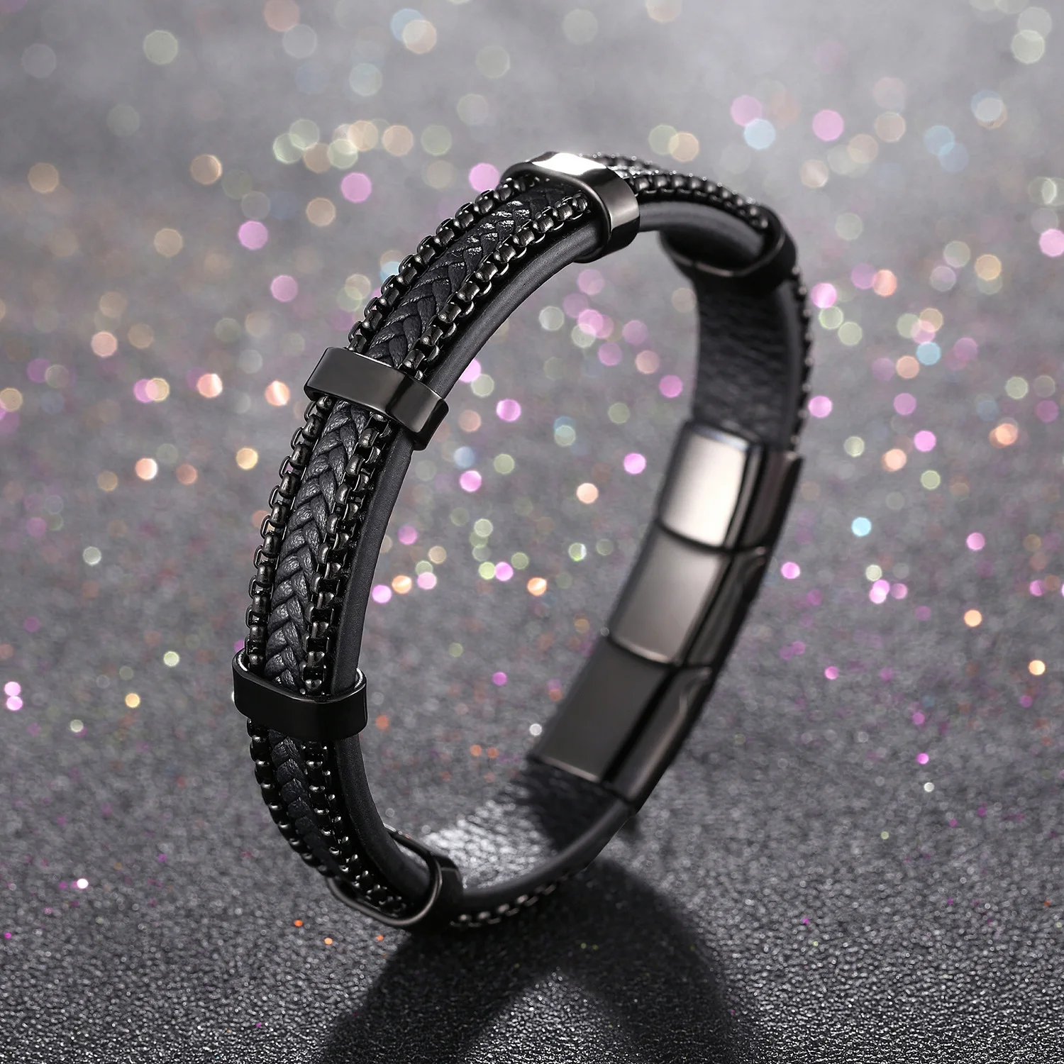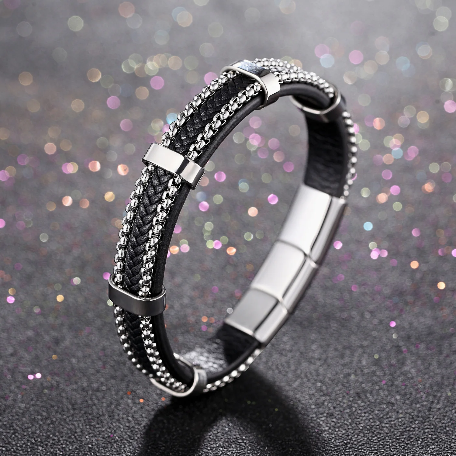 • High Quality Fashion Jewelry Custom 21cm Black Stainless Steel Bracelet for Men Leather Bracelet