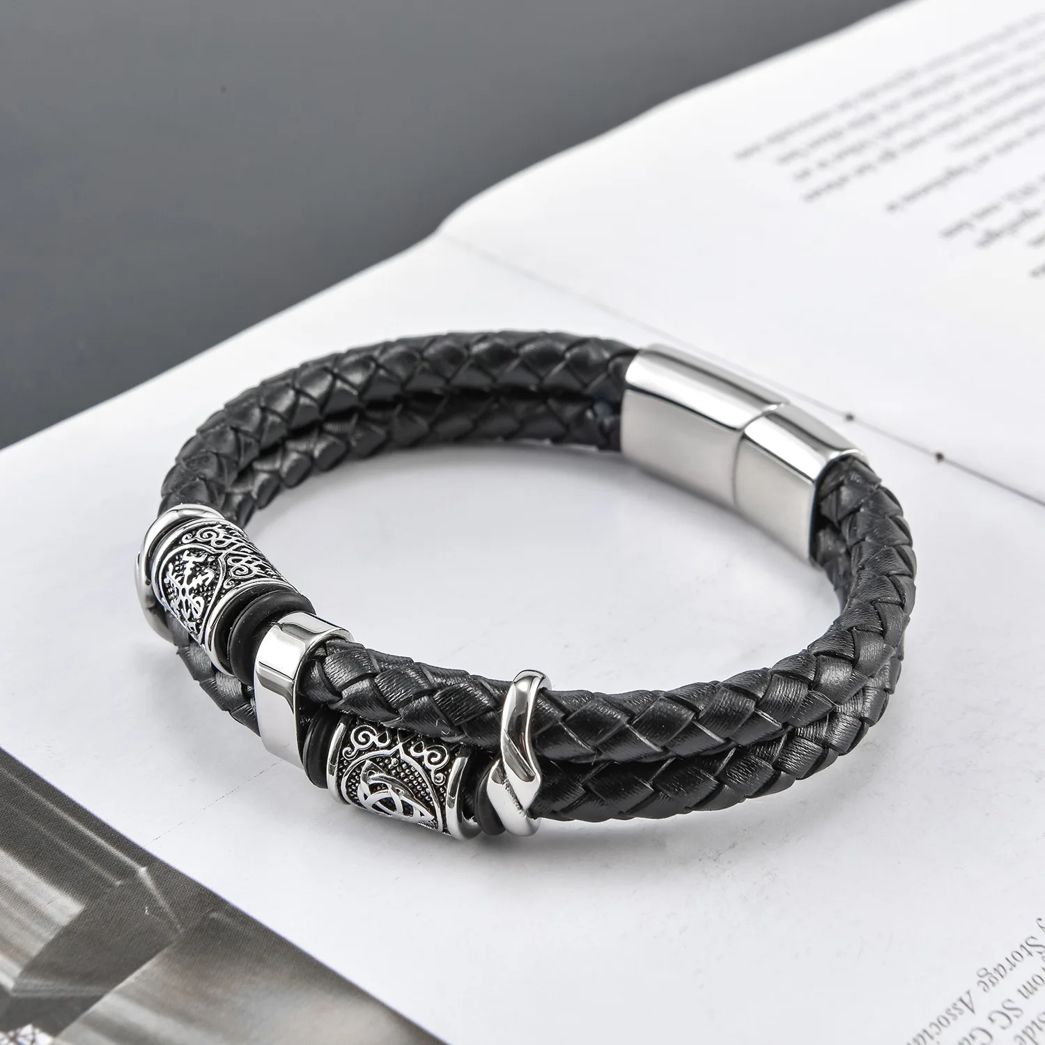 Braided Leather Bracelet; Black Leather With Silver-tone Stainless Steel Ornament, Stand Out But Not Too Gaudy, Go Well With Any Occasion, Great Way to Show You Calm and Lines of Muscle. All Made of High Quality Material, Purely Handmade Tightly Woven Bracelet, Soft and Comfortable Touch Feeling; With Special Stainless Steel Magnetic Clasp, Easy To Put On and No Worry About Losing It During Walk; Strong and Durable, Long Time To Use.