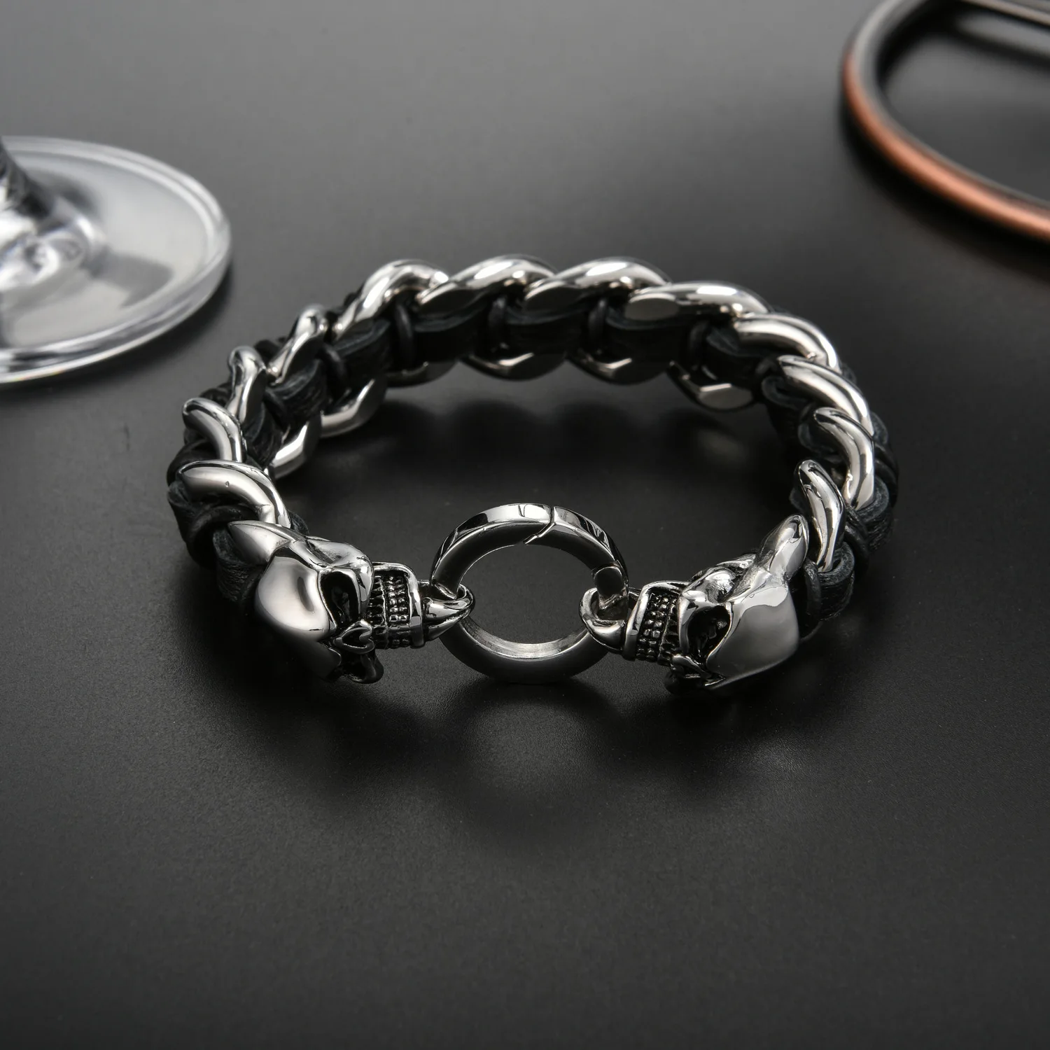Item Model | Hot selling design stainless steel skull silver plated leather bracelet for men |