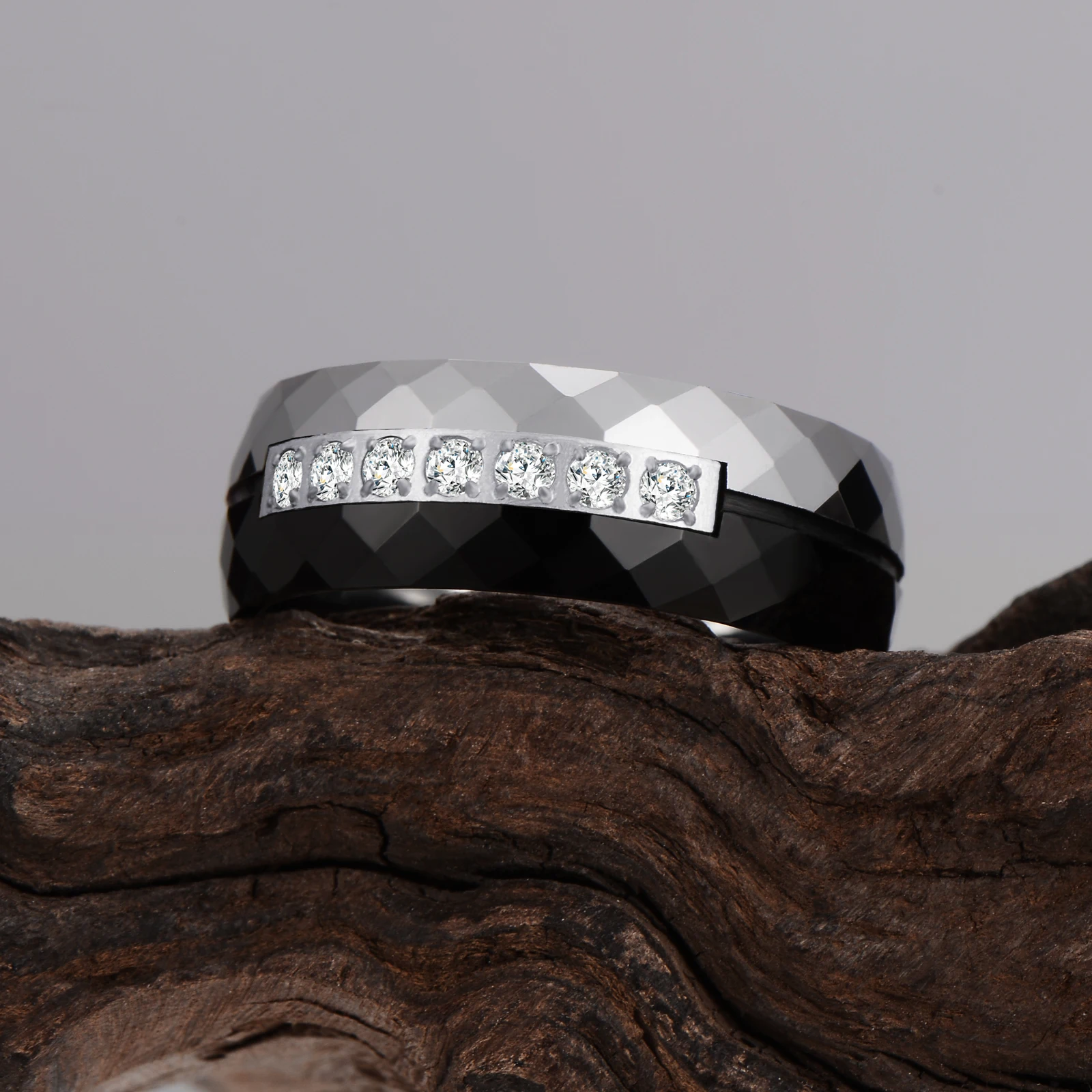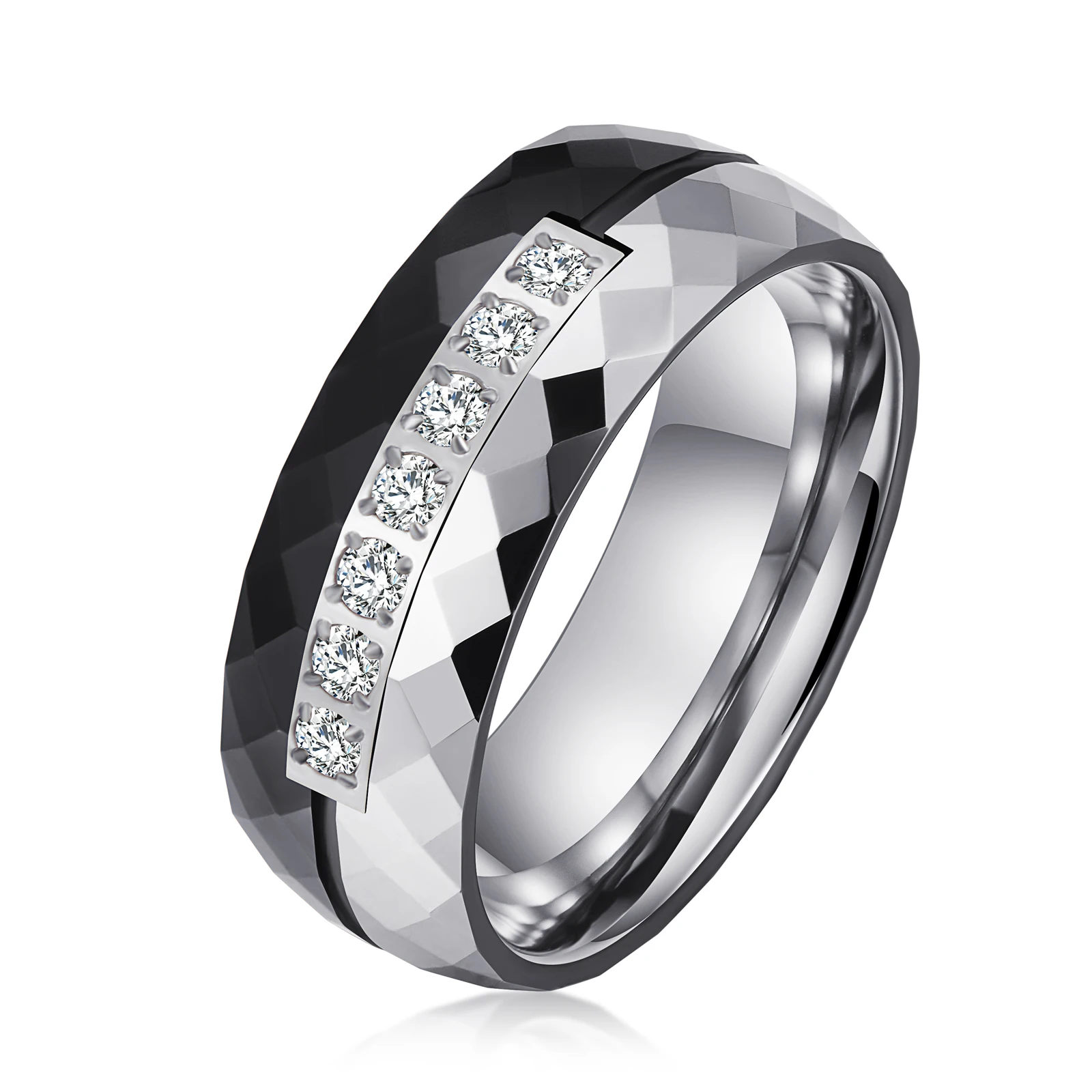 Item Model | Luxury Dome Hammered Silver and black plated Tungsten Ring With Cubic Zircon white Cz Stone Inlay |