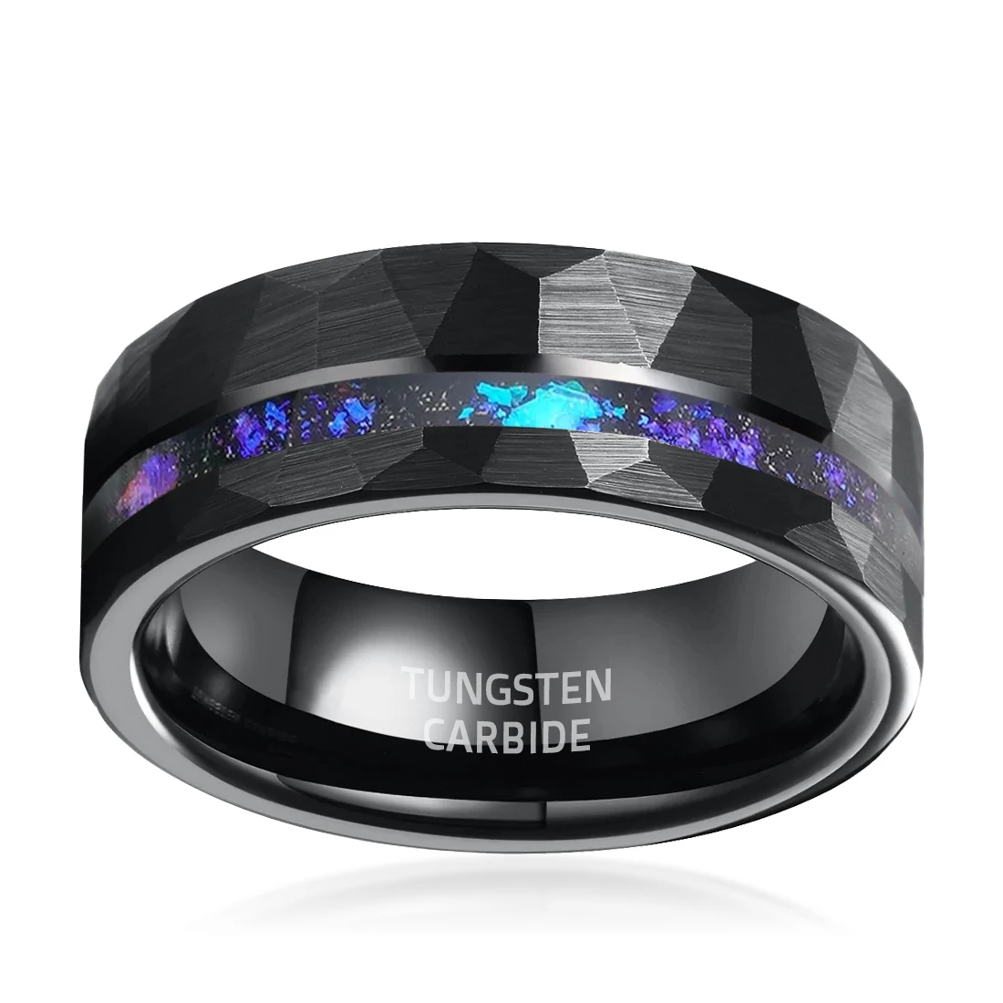• Manufacturer Competitive Price 8mm Hammered Tungsten Carbide Ring Inlay Opal for Men Fashion Wedding Band Black Rings Jewelry