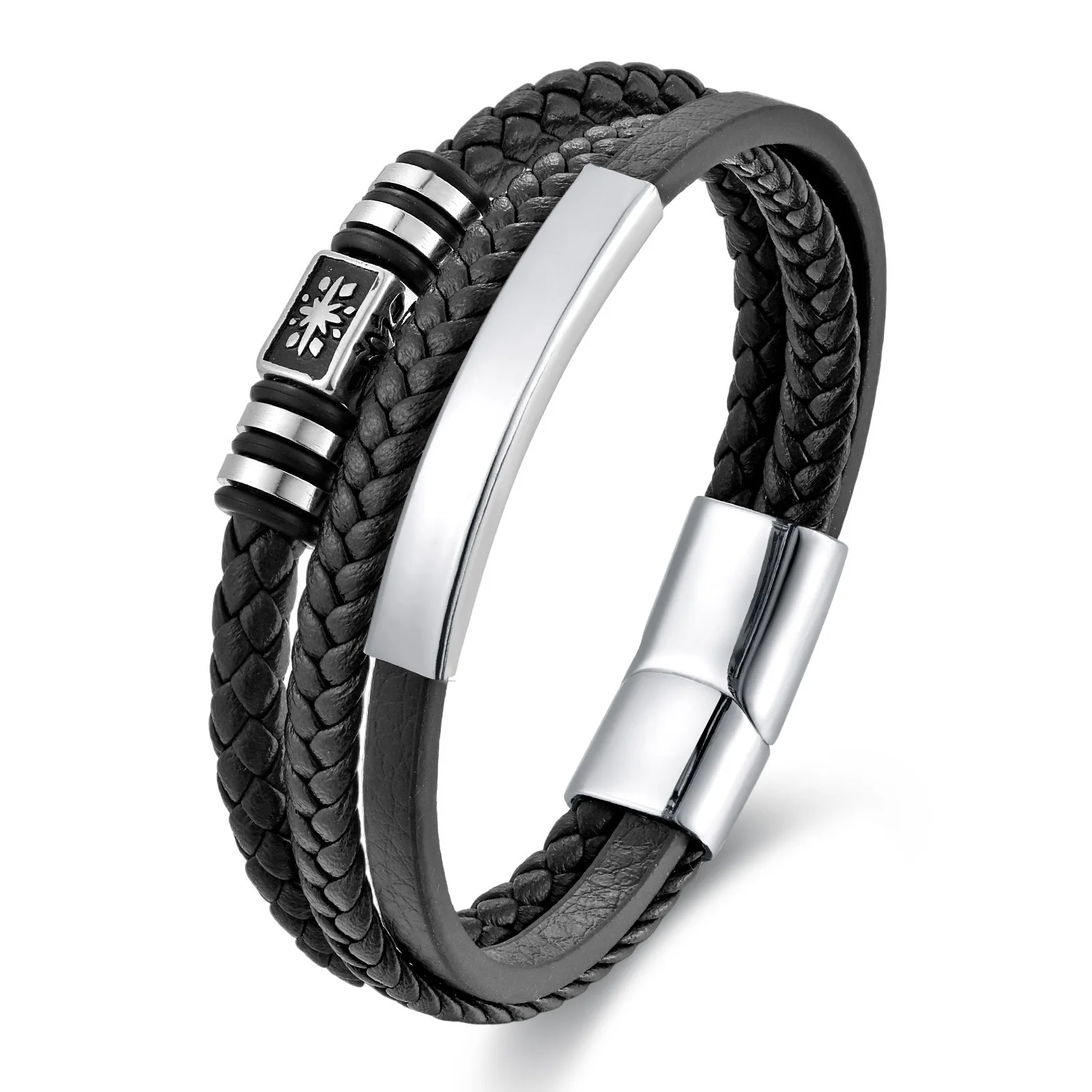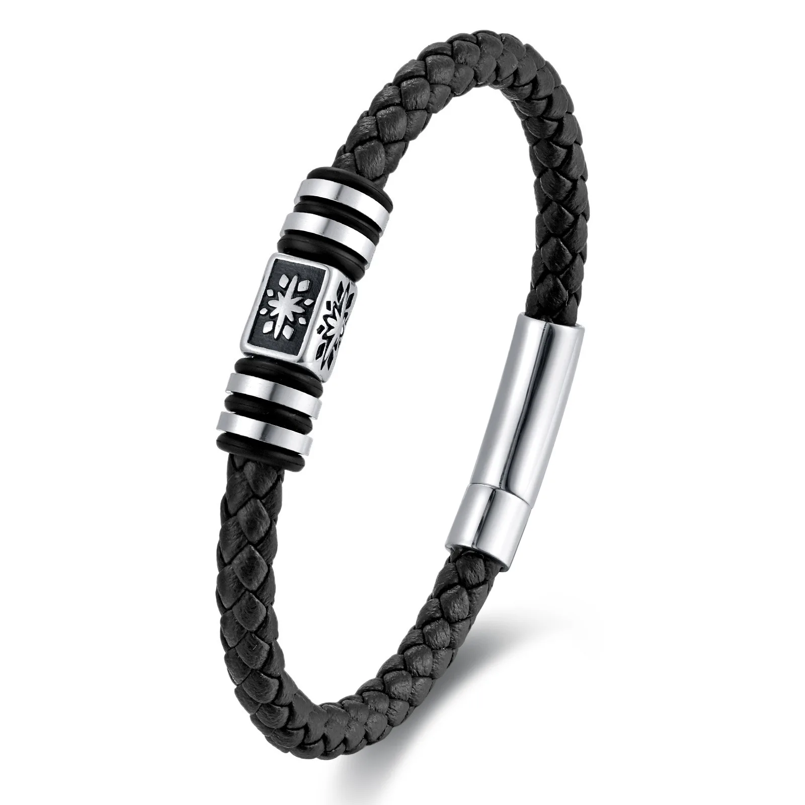 Braided Leather Bracelet; Black Leather With Silver-tone Stainless Steel Ornament, Stand Out But Not Too Gaudy, Go Well With Any Occasion, Great Way to Show You Calm and Lines of Muscle. All Made of High Quality Material, Purely Handmade Tightly Woven Bracelet, Soft and Comfortable Touch Feeling; With Special Stainless Steel Magnetic Clasp, Easy To Put On and No Worry About Losing It During Walk; Strong and Durable, Long Time To Use.