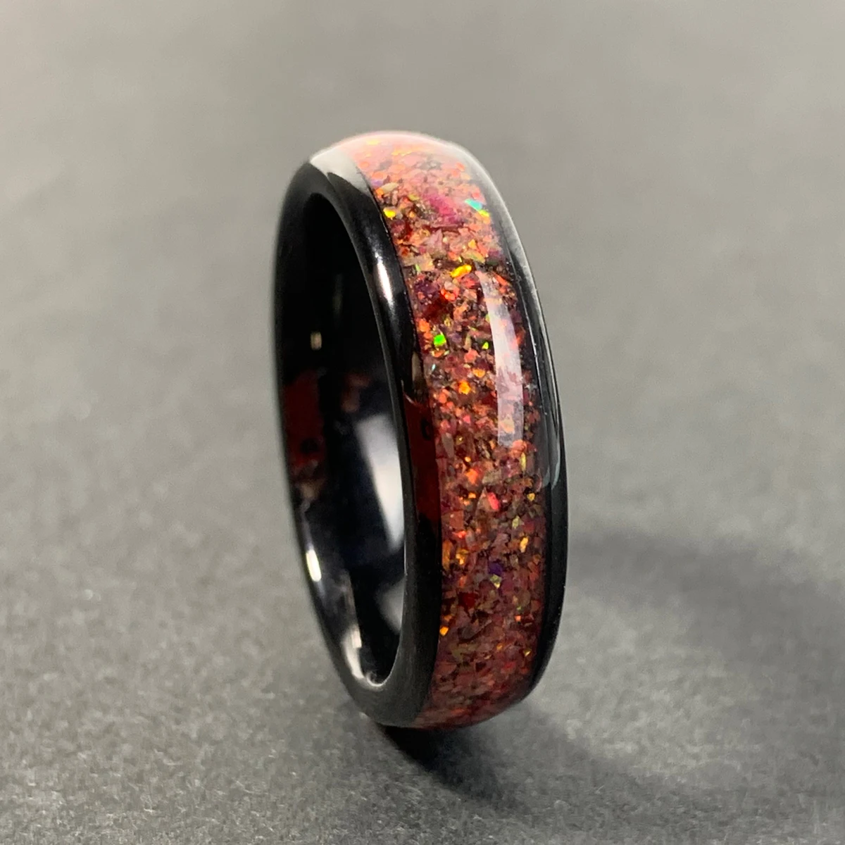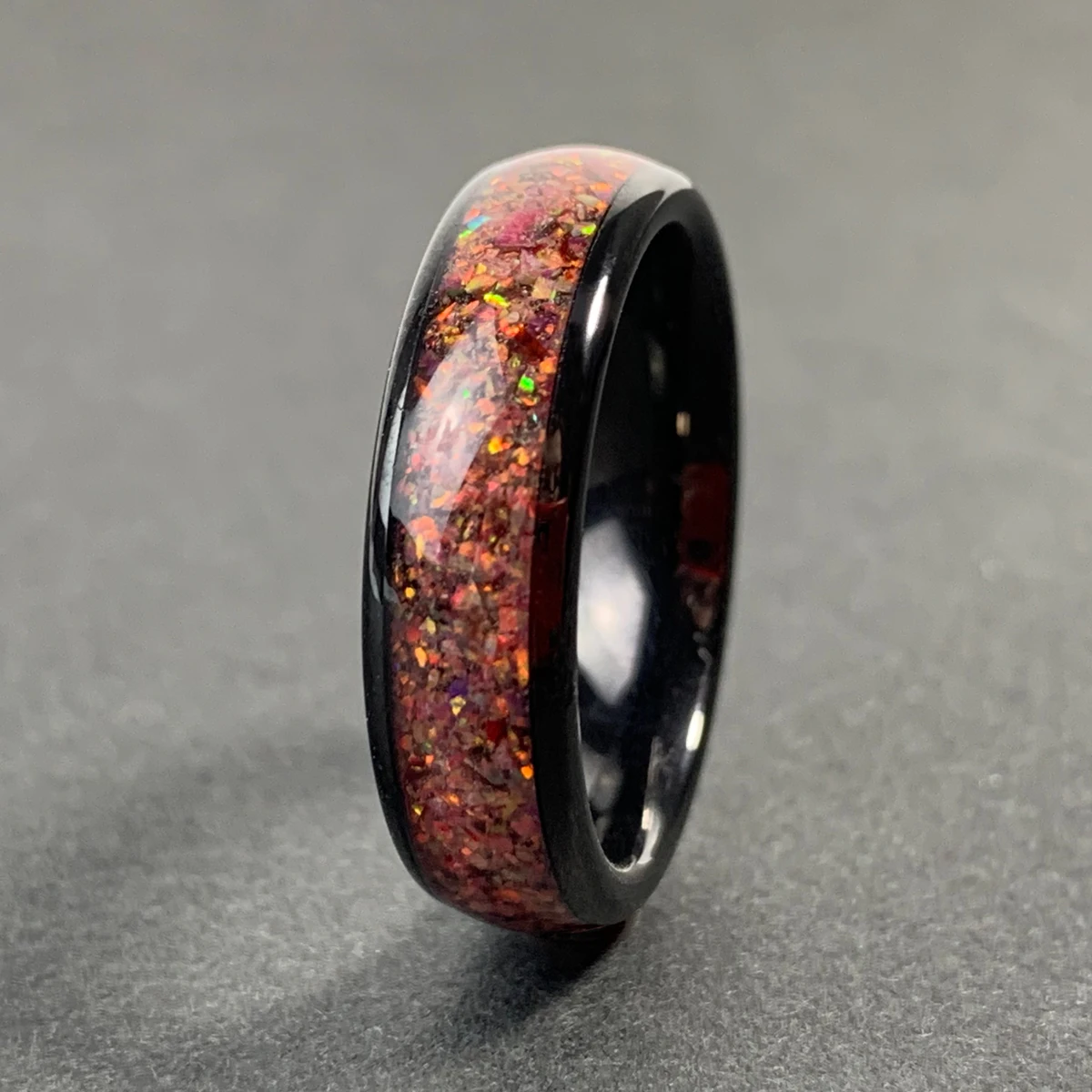 • Ouyuan 8mm Engagement Promise Wedding Band for Men Women Imitated Red Agate Chip Inlay Domed Black Tungsten Ring