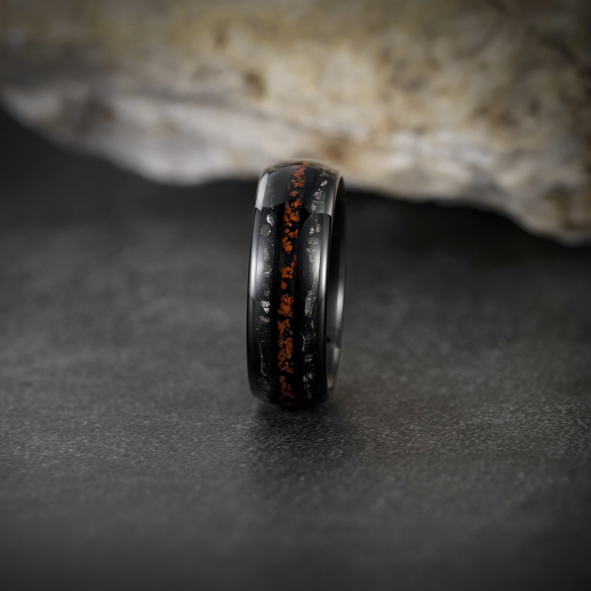 • Ouyuan Factory Fine Jewelry 8mm Dinosaur Stone Meteorite Inlay Black Plated Tungsten Ring for Men Engagement Wedding Band