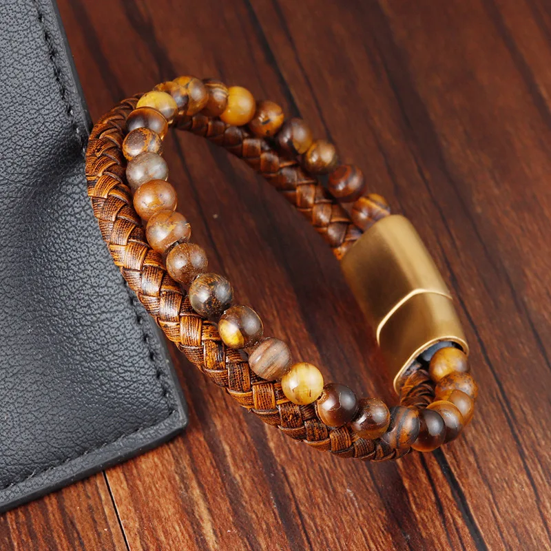 • Retro Multi-layered Braided Yellow Tiger Stone Beaded Stainless Steel Leather Bracelet for Men Versatile Fashion Jewelry