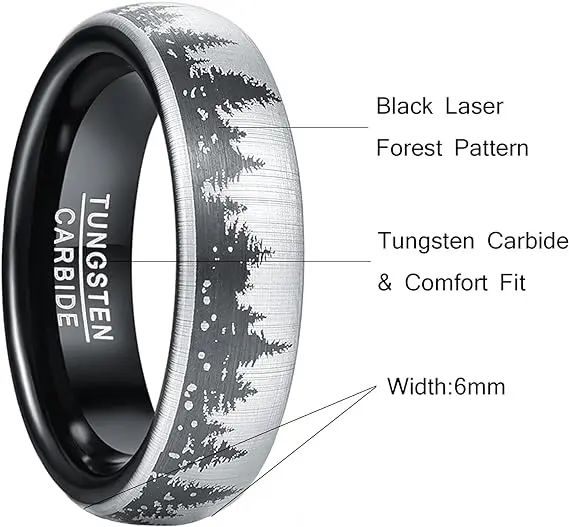 This tungsten carbide ring with a laser-engraved forest land pattern is designed as a robust men ring solution. Specifically targeted at suppliers and retailers of men jewelry rings, it caters to clients requiring durable, cobalt-free tungsten carbide rings. The design supports wholesale tungsten rings purchasers focused on combining aesthetic appeal with industrial-grade hardness, offering custom wedding rings for men and fashion men jewelry alternatives suitable for various market segments and occasions. Its matte finish and detailed engraving meet professional standards for jewelry that must withstand regular handling and maintain long-term wearability.