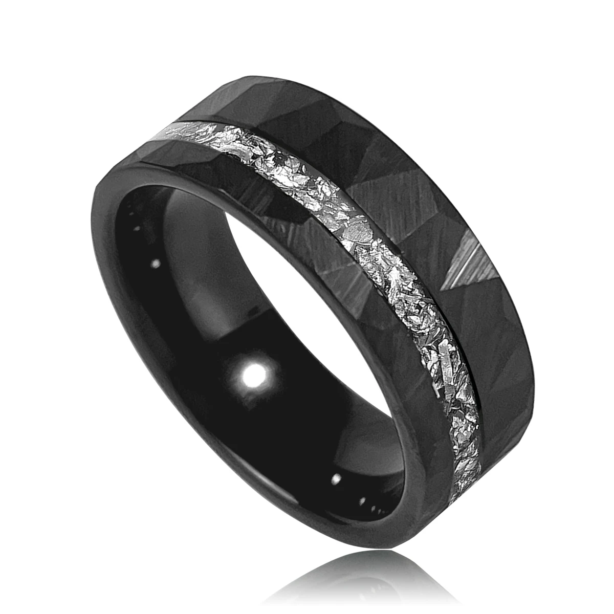 • Wholesale 8mm Brushed Hammered Meteorite Shavings Inlay Black Tungsten Carbide Ring Engagement Wedding Band Gift