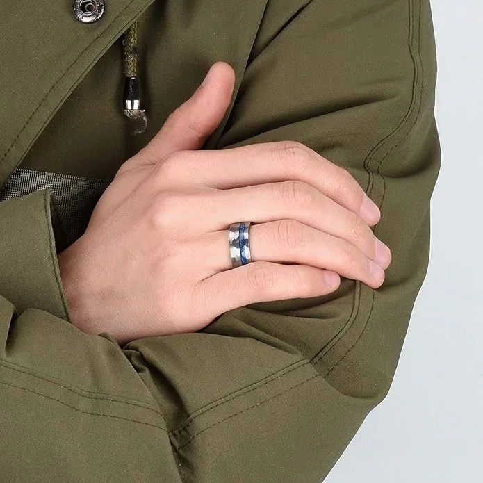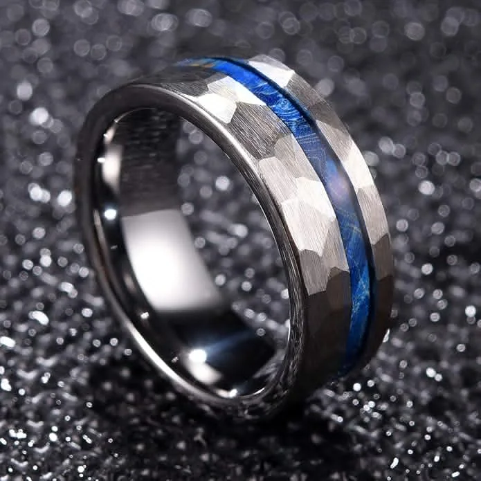 Item Model | Wholesale 8mm Tungsten Jewelry Blue Nature Dyed Elder Wood Silver Hammered Rings for Men Wedding Rings Custom Fashion Rings |