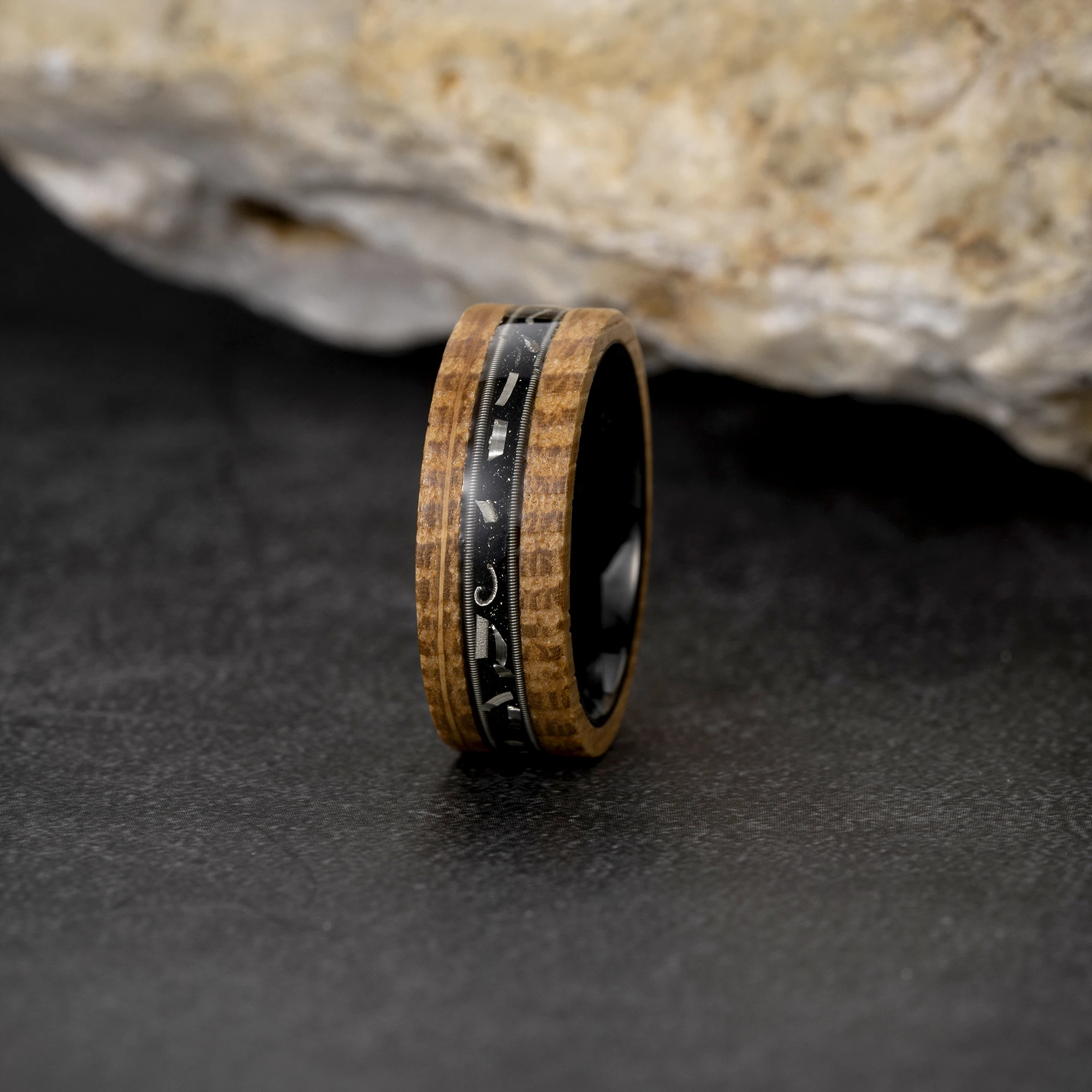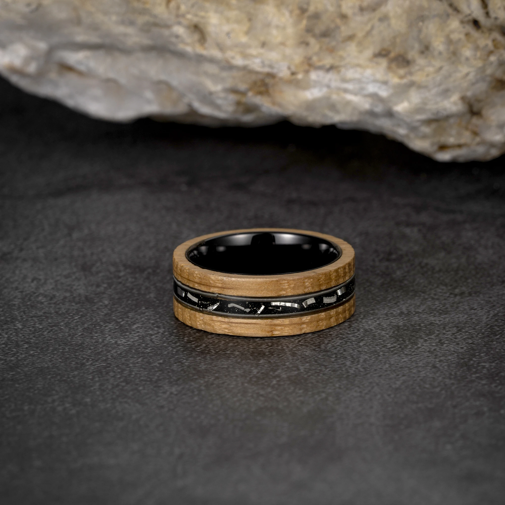 • Wholesale Fashion Jewelry 8mm Tungsten Rings Meteorite Whisky Barrel Wood Silver Guitar String Inlay Wedding Rings for Men Rings